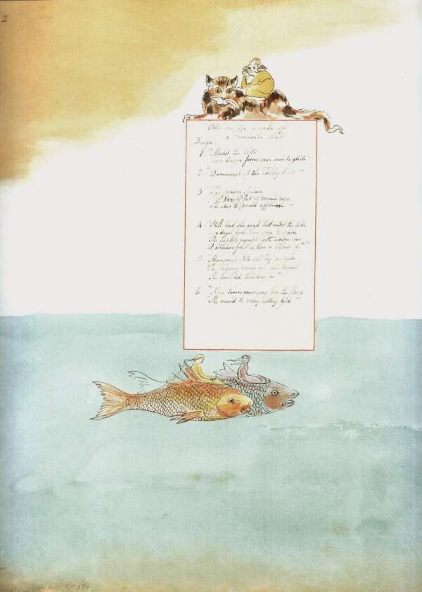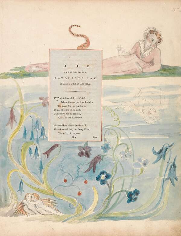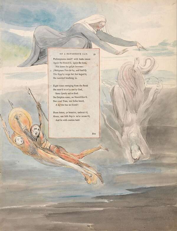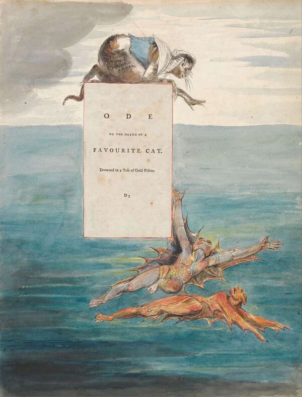 在18世纪的诗歌、绘画中,猫作为宠物的地位日益突出。1747年,英国新古典主义诗人托马斯·格雷(Thomas Gray)创作了《写给溺死在金鱼瓷瓶中的爱猫的挽歌》,缅怀朋友意外身亡的爱猫。大约50年后,英国画家威廉·布莱克在1797年间为这首诗歌绘制了116幅水彩插画(图10-14)。