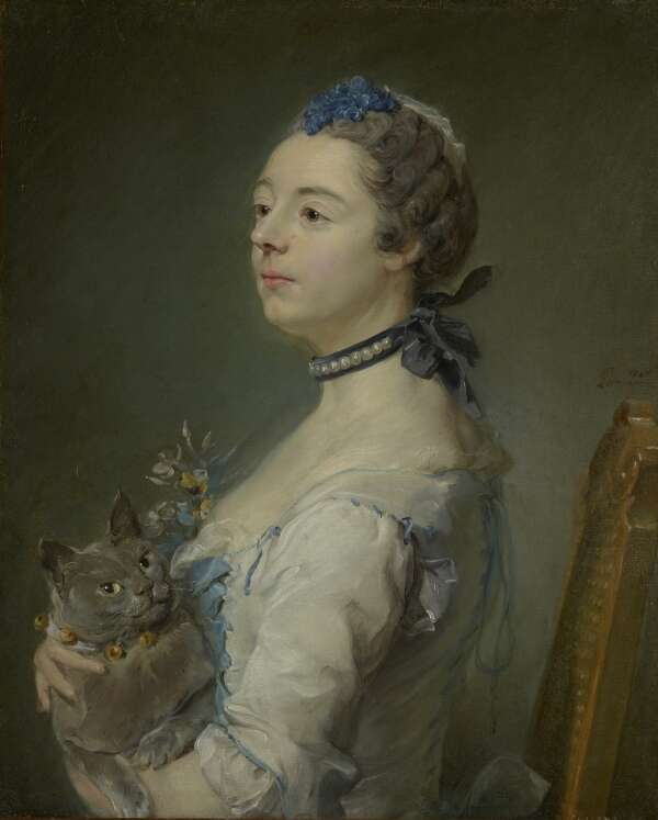 猫作为人类的新宠和它对人类的不服从也体现在法国画家让-巴蒂斯特·佩罗诺(Jean-Baptiste Perronneau)为玛格达琳·平塞卢·德拉·格兰奇 (Magdaleine Pinceloup de la Grange) 夫人画的肖像画(图4)中。这位贵妇人来自一个纺织业家族,该家族专门生产平纹奶酪布。大概因为产业涉及外贸,他们有机会接触到动物交易商,所以才获得这只在当时特别稀有的大蓝猫。格兰奇夫人非常喜欢她的宠物猫,要把它画进肖像里。但画猫可不是一件容易的事情,画中,猫的四肢、颈部和头部都呈现出紧张感,表明它不喜欢被抱。同时,格兰奇夫人笔直地坐着,背部并未接触身后的椅子,一副不自然的模样。她大概在竭力不让猫咪从她的怀中溜掉。猫项圈上的金色铃铛与夫人脖子上的珍珠项链遥相呼应,暗示猫和主人同样雍容华贵。这幅画表明,猫已经融入人类社会,但它依然保有独立性。这幅画同时表明:人类正和猫“斗智斗勇”,比如给猫戴铃铛,这样做既起到一定的装饰作用,又可以阻止猫狩猎的本性有可能带来的麻烦。