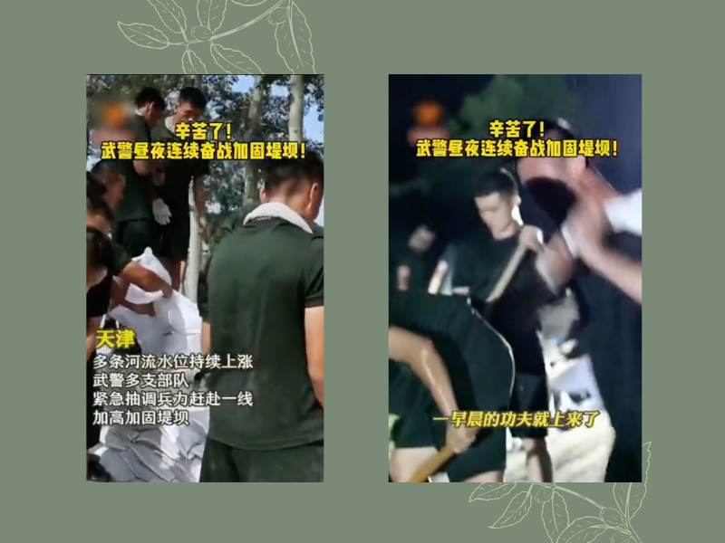 连日来,北京、河北、天津等地持续强降雨,受上游水利枢纽行洪下泄影响,天津武警赴一线参加抗洪抢险。在天津西南方向的东淀蓄滞洪区,武警天津总队1700多名官兵已经在堤坝上连续奋战了3天。当地居民谭贵海负责给官兵运送沙土,战士们的昼夜奋战他都看在眼里,不禁竖起大拇指。“关键时刻还得是咱官兵!”他说。