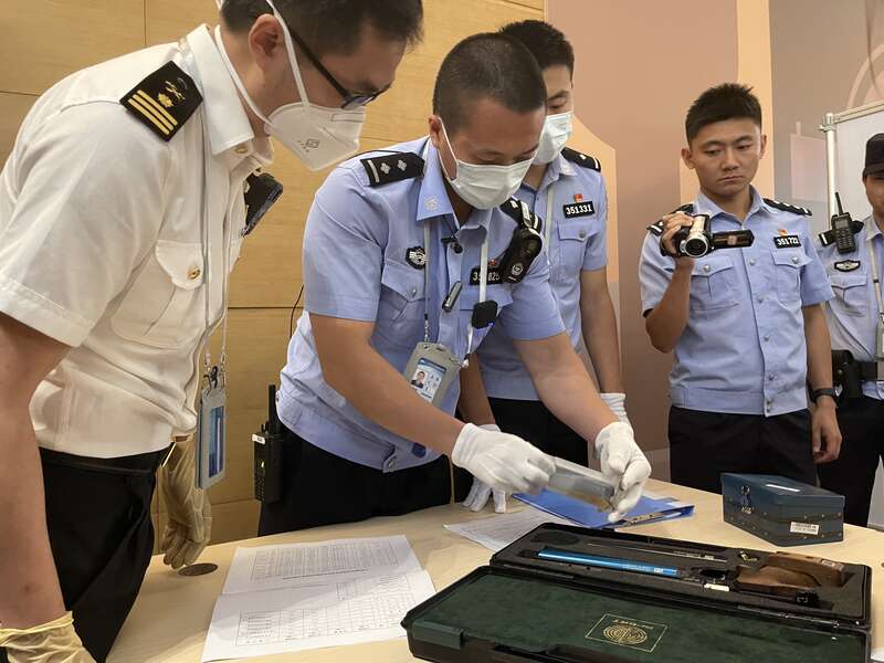 成都边检站民警对比赛枪支进行检查。(成都边检站供图)