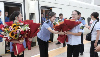 8月7日,Z180次列车42名班组人员乘坐Z69次列车返回乌鲁木齐,手捧鲜花,整齐列队,迎接“英雄班组”的人群早已等候在16号站台。