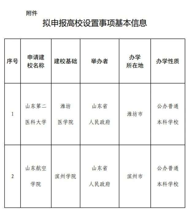 7月31日,山东省教育厅发布公示,拟申报潍坊医学院升格更名山东第二医科大学、滨州学院同层次更名山东航空学院。