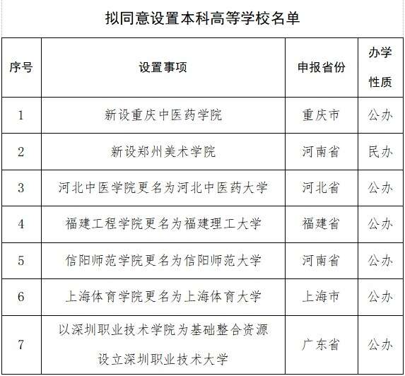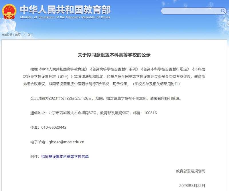 此外,据教育部官网5月22日发布的公示,经第八届全国高等学校设置评议委员会专家考察评议,教育部党组会议审议,拟同意设置重庆中医药学院等7所学校,详情如下: