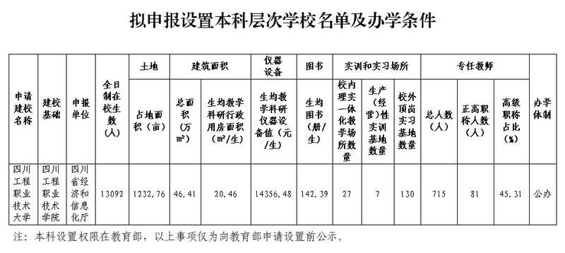 4月20日,四川省教育厅发布公示,拟申报四川工程职业技术学院拟更名为四川工程职业技术大学,升格为公办职业本科。