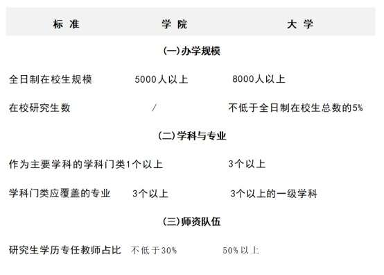关于高校不同名称类型的设置标准,根据2006年教育部印发的《普通本科学校设置暂行规定》,称为大学的,全日制在校生规模应在8000人以上,学科数量、占地面积、师资队伍、教学科研也都有严格的限定。