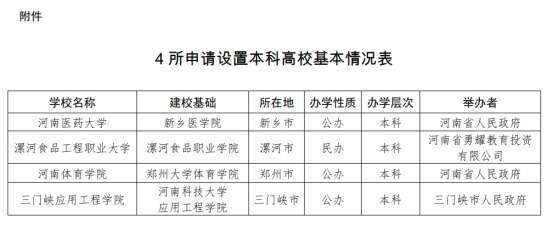 5月9日,河南省教育厅对拟申请新乡医学院更名河南医药大学,设立漯河食品工程职业大学、河南体育学院、三门峡应用工程学院予以公示。