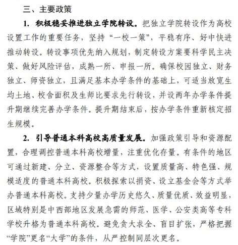 《教育部关于“十四五”时期高等学校设置工作的意见》指出,把独立学院转设作为高校设置工作的重要任务;同时引导普通本科高校高质量发展。