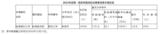 2月13日,安徽省教育厅发布了《关于2023年度第一批拟申报高校设置事项的公示》,蚌埠医学院更名蚌埠医科大学进入公示阶段。