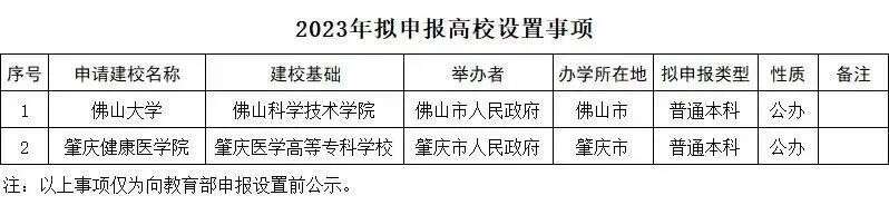 8月7日,广东省教育厅对拟向教育部申报的佛山科学技术学院更名佛山大学、以肇庆医学高等专科学校为基础设置肇庆健康医学院2个事项予以公示。
