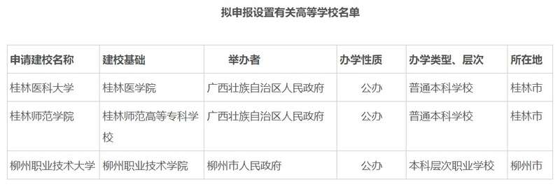 7月31日,广西壮族自治区教育厅发布公示,对拟申报桂林医学院更名为桂林医科大学、以桂林师范高等专科学校为基础设立桂林师范学院、以柳州职业技术学院为基础整合资源设立柳州职业技术大学等3个设置事项进行公示。