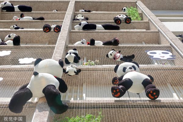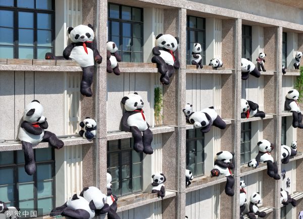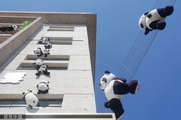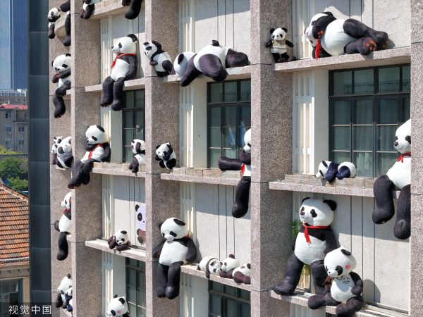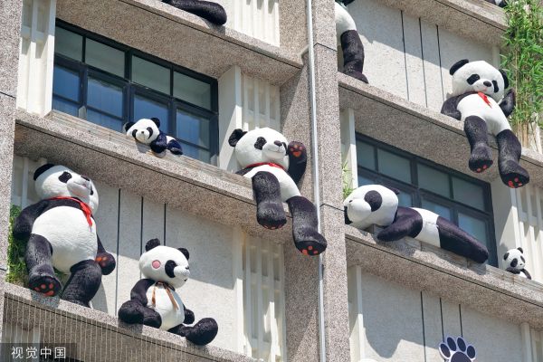 2023年8月10日,山东烟台朝阳街,近百只毛绒熊猫被布置在一家酒店外墙。