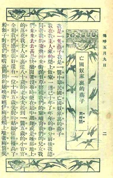 周瘦鹃创作的短篇小说《亡国奴家里的燕子》