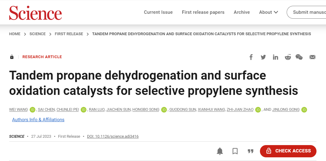 近日,天津大学新能源化工在创新丙烷脱氢催化剂和工艺领域取得重要进展。研究成果以“丙烷脱氢耦合表面氧化过程选择性制备丙烯(Tandem propane dehydrogenation and surface oxidation catalysts for selective propylene synthesis)”为题发表在《科学》(Science)杂志上。