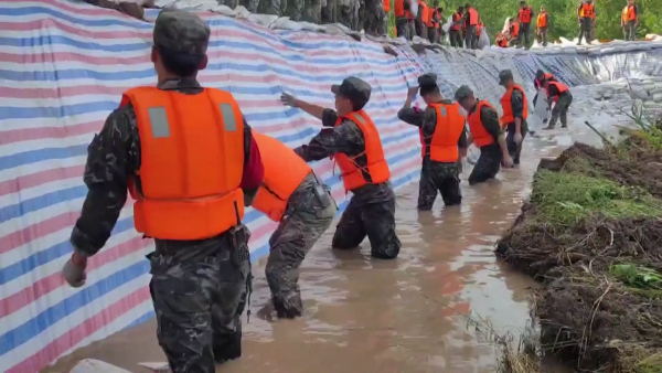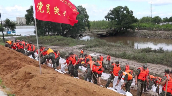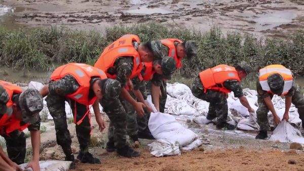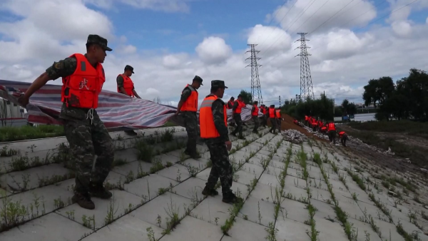 武警黑龙江总队出动数百名官兵在对哈尔滨、牡丹江等地河流堤坝进行防水加固。
