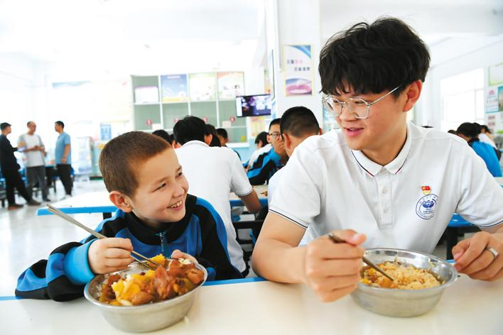 6月27日,新疆精河县托里镇中学,周国澳陪学生祖海依尔一起吃午饭。