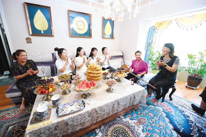 6月27日,樊佳瑞(左二)等支教老师最后一次家访,维吾尔族学生莫尼莎·艾山江弹奏新疆民族乐曲。
