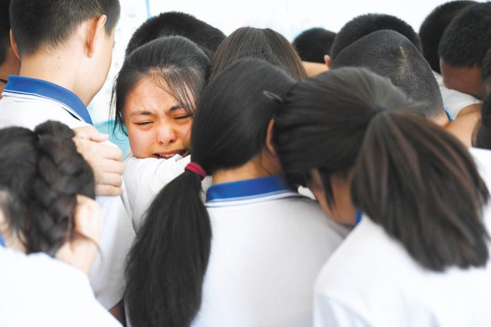 6月27日,新疆精河县托里镇中学,尹明慧和八(1)班38名同学紧紧相拥,泪别校园。