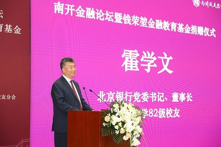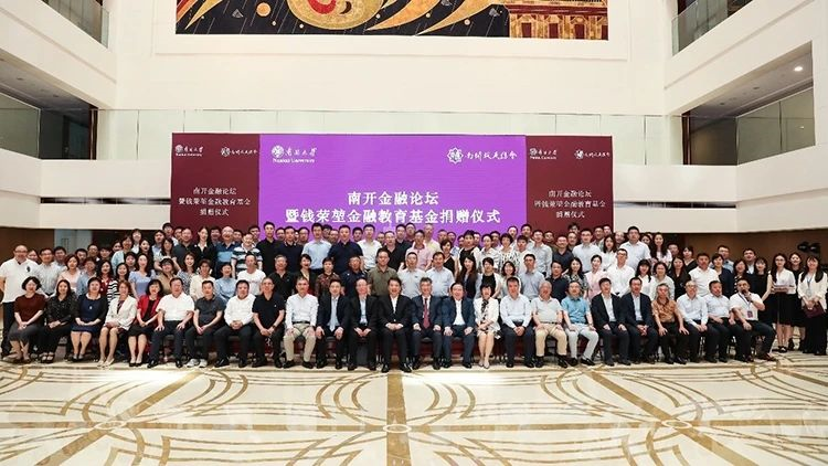 近日, 南开金融论坛暨钱荣堃金融教育基金捐赠仪式 在北京金融街举行。全国人大财经委副主任、南 开大学校长陈雨露,第十四届全国政协常委、经济委员会副主任马建堂,中国国际经济交流中心副理事长王一鸣 ,中国进出口银行党委委员、副行长张文才,中国光大银行执行董事、行长王志恒,中国银行党委委员、副行长张小东,北京银行党委书记、董事长霍学文 ,中金公司首席经济学家、研究院院长彭文生,南开校友总会金融校友分会会长、南开大学金融学院联席院长、英蓝集团副董事长刘禹东,以及金融界校友、南开大学教育基金会、金融学院、校友办负责人等近200人参加。
