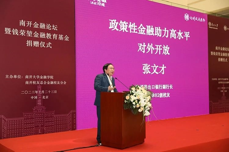 张文才 校友发表《政策性金融助力高水平对外开放》 主题演讲,表示进出口银行自成立以来,紧紧围绕对外经贸投资和国际经济合作,为服务我国对外开放,开展了大量富有成效的工作,已成为“一带一路”建设主力融资银行。为贯彻落实党中央关于高水平对外开放的决策部署,进出口银行将在提升贸易投资合作质量和水平、支持共建“一带一路”高质量发展、统筹发展与安全、促进区域协调发展和开放平台建设、助力稳步扩大制度型开放以及有序推进人民币国际化等方面,进一步发挥政策性金融作用,更好服务国家战略和实体经济,在推动构建以国内大循环为主体、国内国际双循环相互促进的新发展格局中贡献力量。