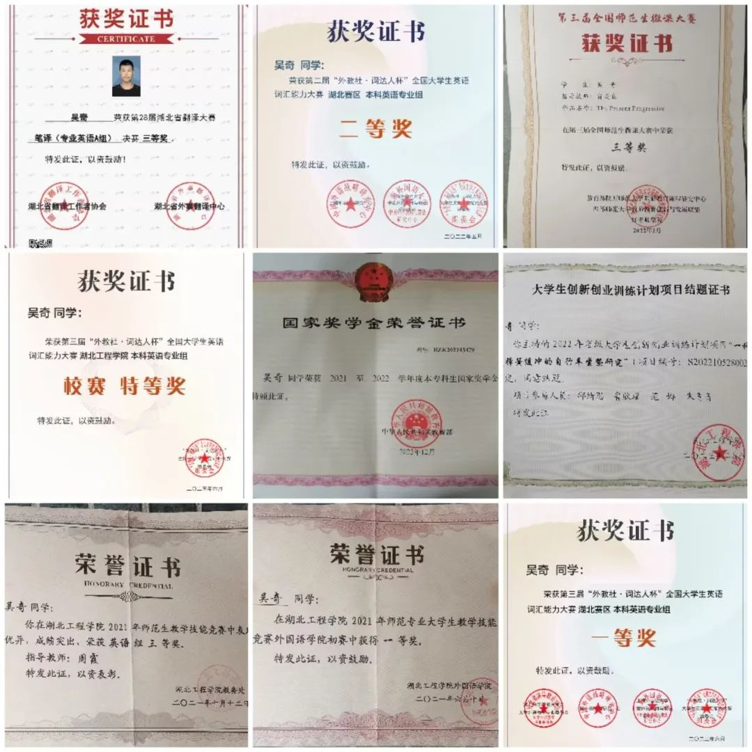 (吴奇获得的部分证书)