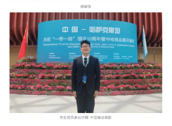 知行合一,展现青年风采。 5月18日至19日,中国-中亚峰会在陕西西安成功举办,本科生第二党支部2019级俄语-中亚语专业孟飞宇作为此次峰会活动联系人,完成商务代表团的全程对接、陪同接待等任务,因务实肯干、吃苦耐劳的突出表现,获得主办单位的赞扬,充分展现了民大学子阳光向上、无私奉献的优良品质。