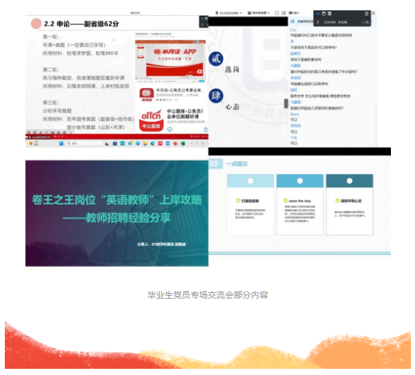 榜样力量,提升育人成效。榜样是一座灯塔,指引方向,各学生党支部积极推进“朋辈引领”成长接力工程。6月15日至20日期间,18名优秀毕业生党员聚焦保研、考研、选调生、公务员等专题,举办9个专场交流会,累计参加学生达300人次。此次交流会,不仅帮助同学们全方位、多层次地了解就业信息和职业发展前景,也引导学生树立正确的就业观、择业观。