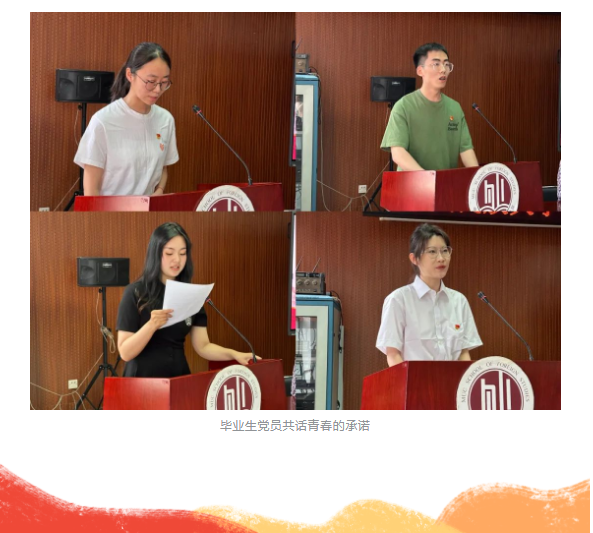 毕业生党员全员学。 6月20日,学院组织开展“传承建党精神,建功新时代”2023届毕业生党员主题教育,为97名全体毕业生党员上好大学“最后一堂党课”。活动开始前,学院在每位毕业生党员的座位上准备了“临别礼”,一枚党徽、一本党章、一张政治生日卡,希望每一位毕业生党员始终与党同心、跟党奋斗。活动中,常安旖旎、赵斯涵、刘宇、洪承熙等4名同学代表毕业生党员庄严承诺,要做一个眼中有光、脚下有路、肩上有责、心中有德的新青年。最后,通过重温入党誓词,全体毕业生党员铭记党员的责任和荣耀,将党的二十大精神内化于心、外化于行。