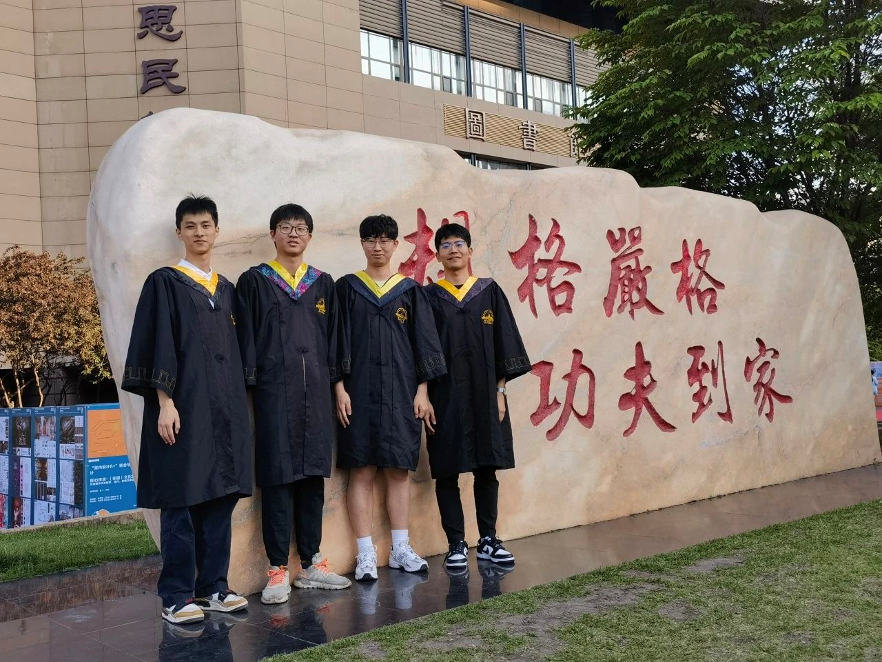 王培晨(左二)和同学在校训石前