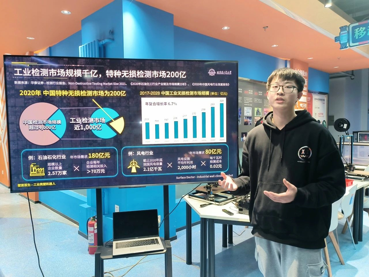 一个偶然的机会,王培晨接触到了第一个科创项目——工业爬壁机器人,从此开启了自己的创新创业之旅。
