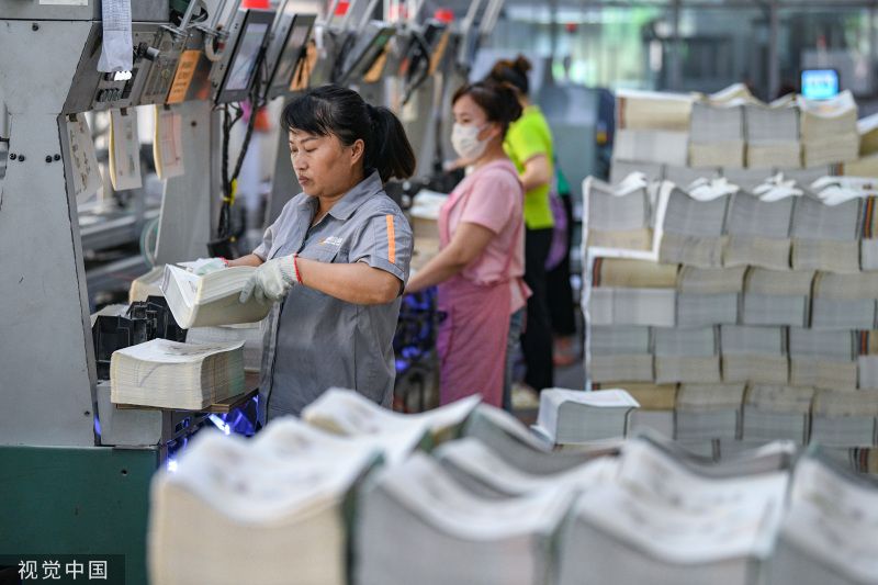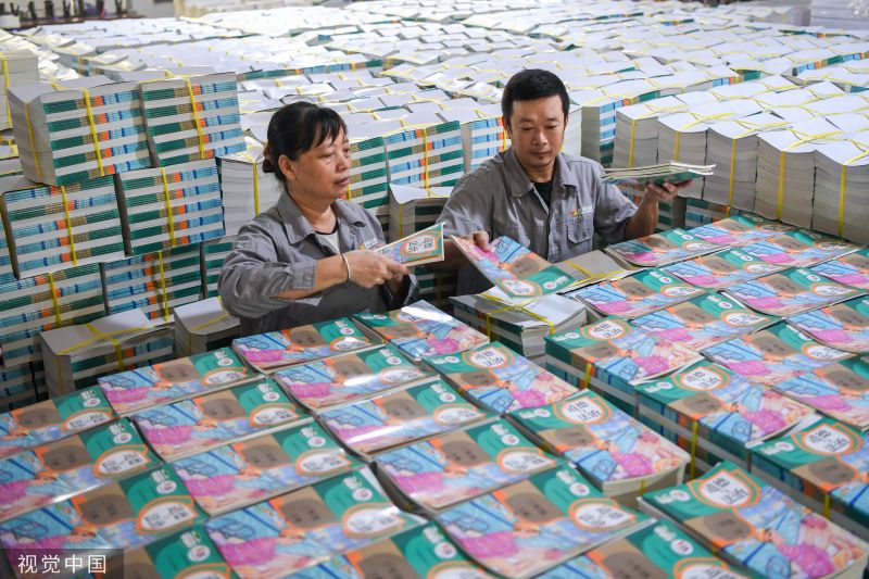 2023年8月9日,在海南省海口市海南凤凰新华出版发行有限责任公司承印企业,2023年秋季中小学教材正在紧张有序印制发行中,确保“课前到书”。