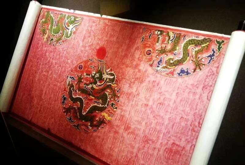 明万历帝孔雀羽妆花纱袍料。 江宁织造博物馆供图