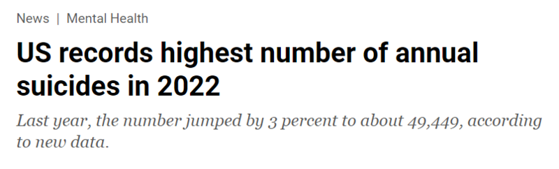 报道称,从21世纪初到2018年,美国的自杀率稳步上升,达到1941年来的最高水平。虽然自杀率在2019年和2020年略有下降,但2021年又上升了4%。根据最新的数据,2022年美国的自杀人数达到49449人,较前一年增加了约3%。