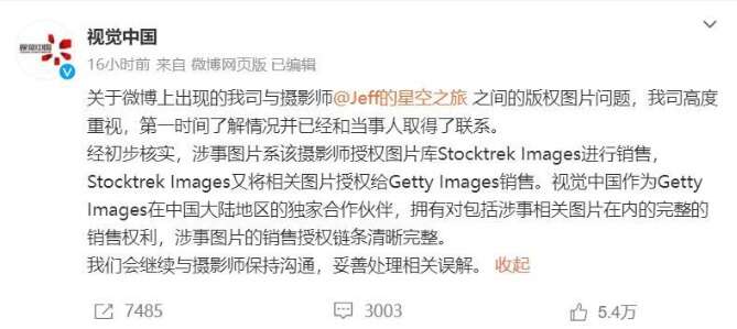 8月15日,知名摄影师戴建峰发文称,他接到视觉中国的电话,对方称自己拍摄的作品对视觉中国的173张照片造成侵权,需要赔偿8万元。8月15日晚,视觉中国回应称:涉事图片的销售授权链条清晰完整,会继续与摄影师保持沟通,妥善处理相关误解。