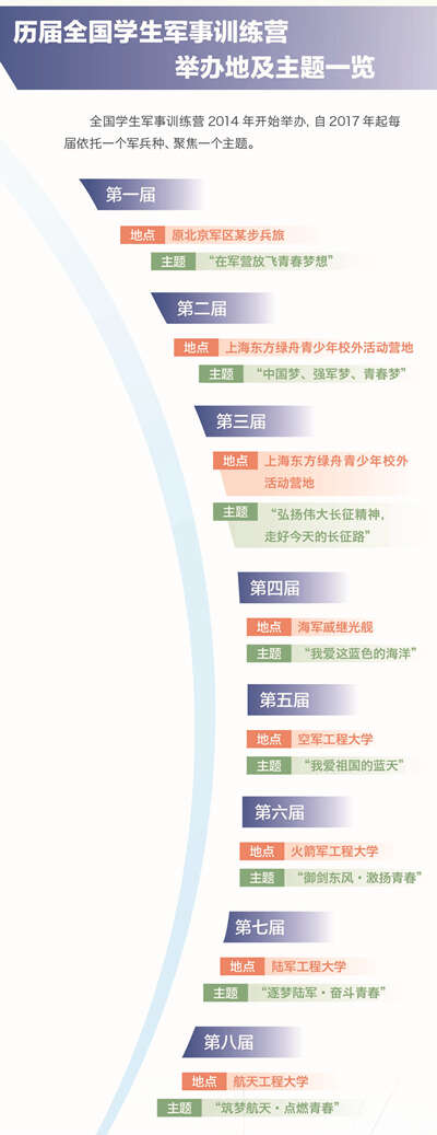 2017年8月,国务院办公厅、中央军委办公厅颁发关于深化学生军事训练改革的意见,要求“定期举办学生军事训练营”,扎实深化学生军训改革。举办军事训练营成为检验学生军事训练效果、推进学生军事训练工作创新发展的途径之一。