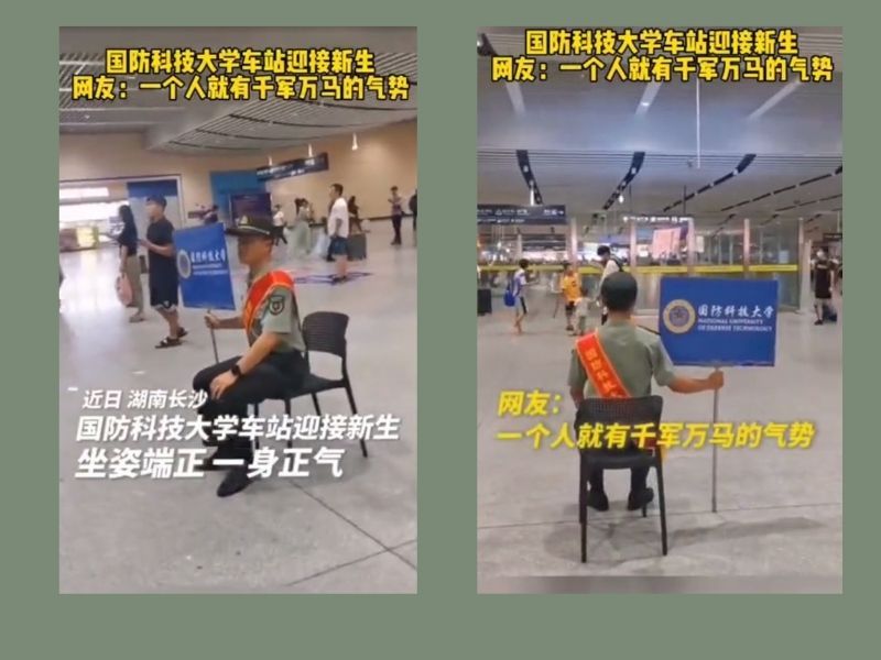 近日,湖南长沙,国防科技大学学长在车站迎接新生,他坐姿端正,一身正气。网友:一人就有千军万马的气势。