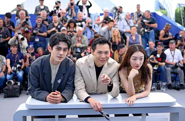 陈哲艺(中)携《燃冬》主演刘昊然(左)、周冬雨亮相2023年第76届戛纳电影节,该片入围“一种关注”单元