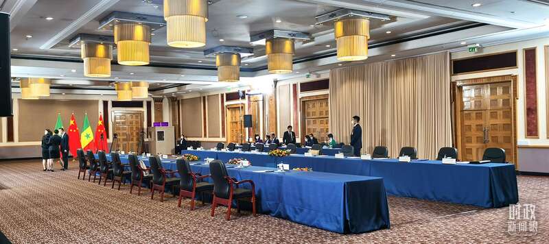 △会见现场的中塞两国国旗。(总台央视记者卢心雨拍摄)