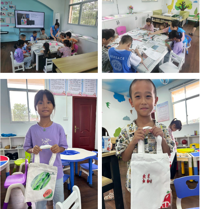 为丰富留守儿童的暑期生活,东上乡瑶前村童心港湾联合青年志愿者们一起开展“七彩假期“专项活动,组织带领孩子们开展帆布包绘画游戏。孩子们充分发挥自己的想象力,在童伴妈妈和志愿者们的鼓励和帮助下,绘制出了属于自己独一无二的手工作品。