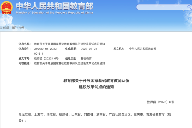 中国青年报客户端北京8月29日电(中青报·中青网记者 樊未晨)记者今天从教育部获悉,教育部印发了《教育部关于开展国家基础教育教师队伍建设改革试点的通知》,部署在上海市、山东省、青海省、福建省厦门市、湖南省常德市、黑龙江省黑河市嫩江市、浙江省温州市瓯海区、河南省商丘市永城市、广西壮族自治区桂林市荔浦市、重庆市云阳县等省、市、县10个地区开展国家基础教育教师队伍建设改革试点。