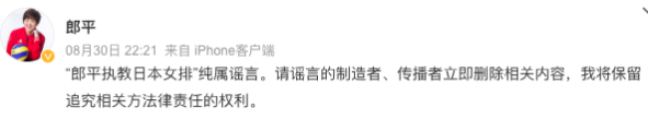 8月30日晚,郎平通过社交媒体发文辟谣称,“郎平执教日本女排”纯属谣言。“请谣言的制造者、传播者立即删除相关内容,我将保留追究相关方法律责任的权利。”郎平在文中写道。