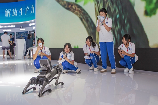9月4日,在2023智博会科大讯飞展厅,讯飞工业巡检机器人与观众互动。