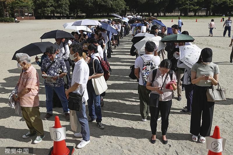 当地时间2023年9月5日,日本京都地方法院,人们排队购买入场券,以参加京阿尼纵火案的听证会。