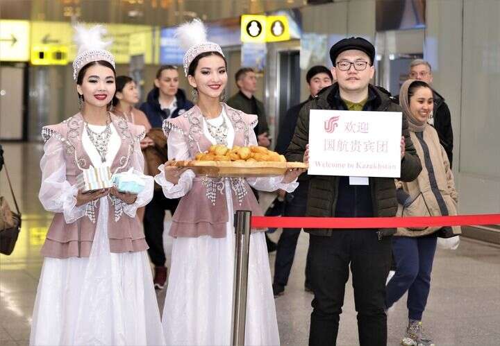 4月21日,在哈萨克斯坦首都阿斯塔纳的纳扎尔巴耶夫国际机场,哈方工作人员为搭乘国航北京-西安-阿斯塔纳航线首班飞机抵达的旅客举行欢迎仪式。