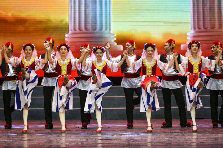 7月21日,哈萨克斯坦萨尔塔纳国家舞蹈团在新疆人民剧场登台首演,为观众带来歌舞晚会《富饶的家乡》。