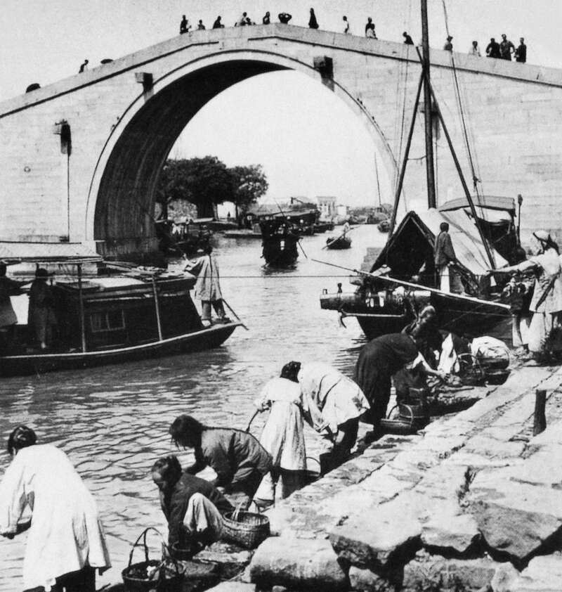 1900年,苏州吴门桥下,京杭大运河上的船只及清洗东西的妇女