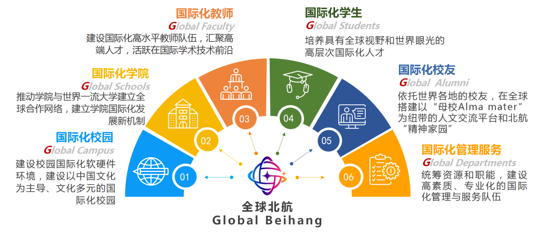 北京航空航天大学将国际化融入办学各项工作,以“走向全球、点亮未来”为国际化工作愿景,以“高质量、可持续、合作共赢”为基本原则,构建“学校主导、学院主责、师生主体”国际交流合作体系,实施“6G”方略。