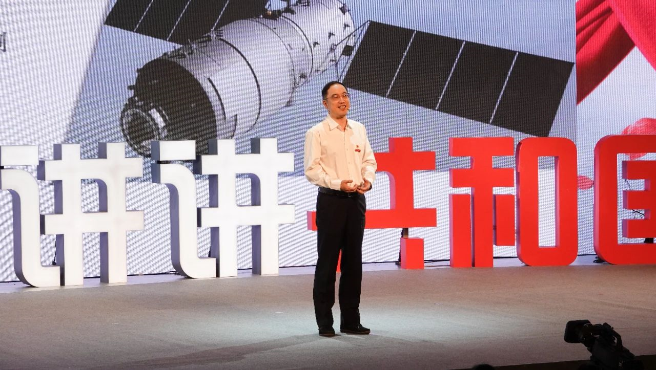 (陈南梁在上海市教育系统庆祝中华人民共和国成立70周年主题活动中,与大中小学生分享东华纺织智造助力航空航天发展的故事)