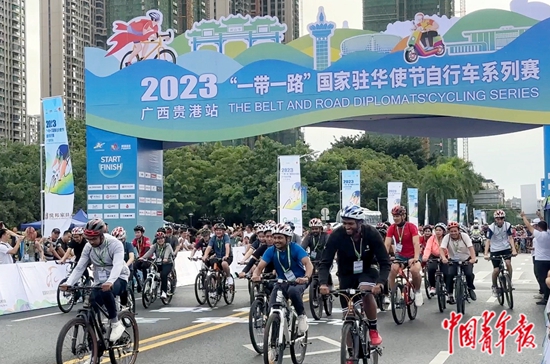 2023“一带一路”国家驻华使节自行车系列赛首站比赛于9月10日在广西贵港举办,来自英国的克里斯托弗边骑车边回头,发现同组选手在视野里变得越来越小,他第一反应是“糟了,我可能骑错路了”,直到一抬眼看见终点,他才意识到“冲刺的时刻到了”。