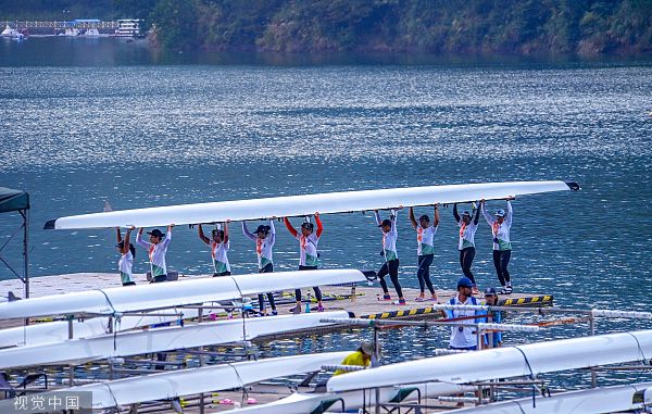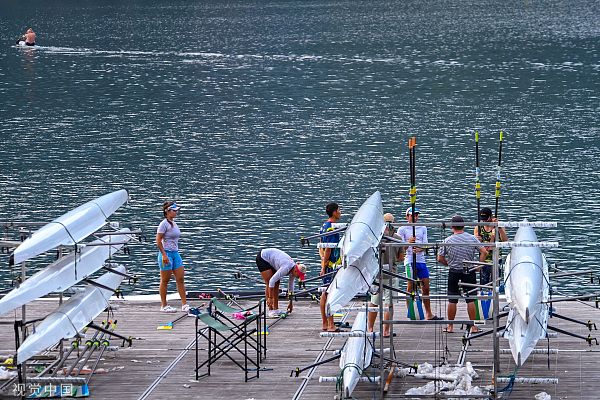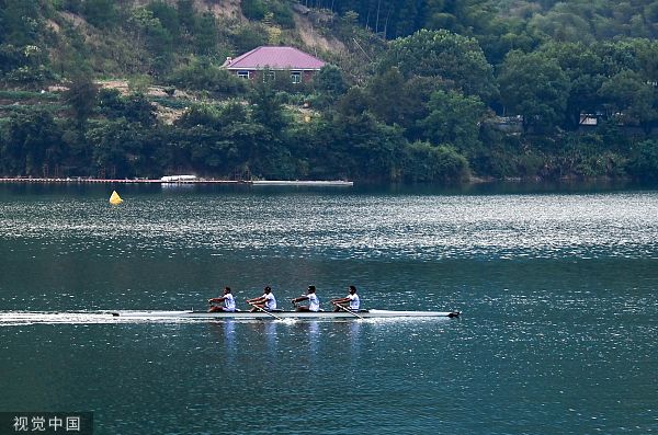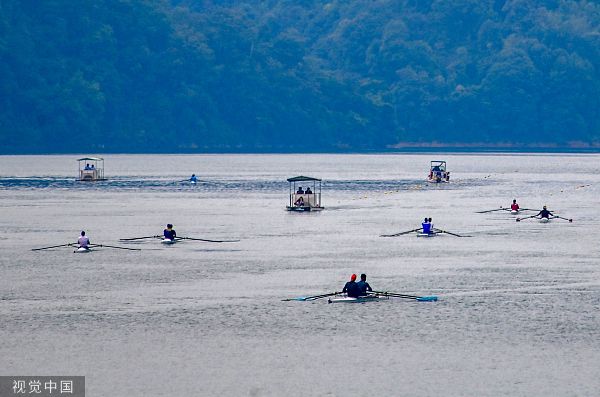 2023年9月12日,杭州,淳安县石林镇水上运动基地,来自多个国家的亚运赛艇国家队进行适应性训练。