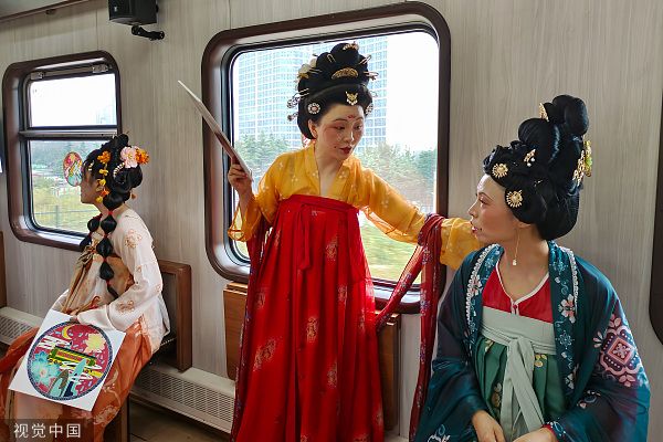 在车厢内,旅客不仅可以看到精心复原的汉服、甲胄,还可以亲身体验换装,“穿越变身”为汉唐的美女、帅哥,让整趟旅程充满了时空交错的新奇感。